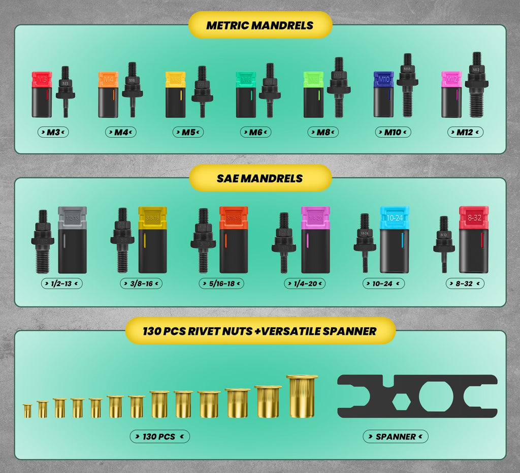 【Multi Accessories】①16" RIVET NUT TOOL WITH 13 MANDRELS:Equipped with 13pc interchangeable mandrels(Metric M3 M4 M5 M6 M8 M10 M12; SAE 8-32,10-24,1/4-20,5/16-18,3/8-16,1/2-13) and 130pc rivet nuts.A useful spanner (Please note that the M8 mandrel was installed in the gun, so the small box of M8 is empty. All pieces are packed in a rugged, compact carrying case for storage and portability. ②16" RIVET NUT TOOL WITH 7 MANDRELS: Equipped with 7pc interchangeable mandrels(Metric M5 M6 M8; SAE 1/4-20,5/16-18,3/8-16,1/2-13) and70pc rivet nuts.A useful spanner (Please note that the M8 mandrel was installed in the gun, so the small box of M8 is empty. All pieces are packed in a rugged, compact carrying case for storage and portability.
