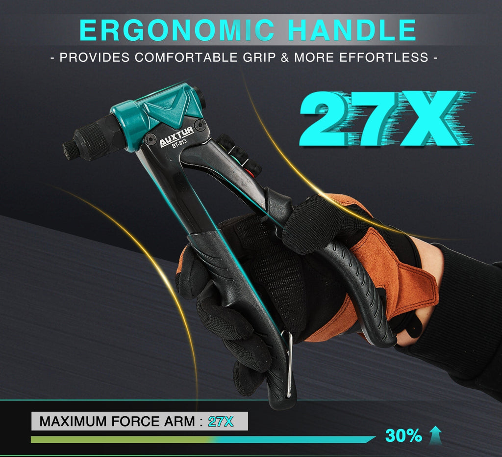【Ergonomic Grips and Handle Lock】The ergonomically designed handle of the rivet gun allows for effortless and easy riveting tasks. This manual rivet gun comes with a PVC handle cover to protect your hands from injury, and the handle lock design allows for good storage and easy carrying.